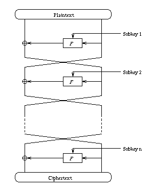 ICE is a standard Fiestel block cipher, as illustrated below. It takes a 64-bit plaintext, which is split into two 32-bit halves. In each round the right half and a 60-bit subkey are fed into the F-function. The output of F is XORed with the left half, then the halves are swapped. This is repeated for all but the final round, where the final swap is left out.